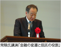 講演では、三井住友トラスト・グループ(今年4月1日に中央三井トラスト・グループと経営統合)の住友信託銀行(株)取締役会長兼社長常陰 均氏(新制25期)から「金融の変遷と信託の役割」と題して、昭和後期から平成の金融の変遷について、分かり易くお話しいただきました。特に、不良債権処理のような問題は、先送りすればするほど解決策の選択肢が狭まるため、早め早めの対応が重要であること、リーマンショックのようにリスクの全体像が把握しにくい問題についても、問題を避けずに正面から直視して取り組むことが必要であること等、ご経験に裏打ちされた非常に示唆に富むお話をいただきました。また、混迷に満ちた時代であるがこそ、委託者・受託者・受益者の「信頼(trust)」に基づく「信託(trust)」の精神をベースとした真に顧客本位の経営が肝要である、とのお話に聴衆一同深い感銘を受けた次第です。